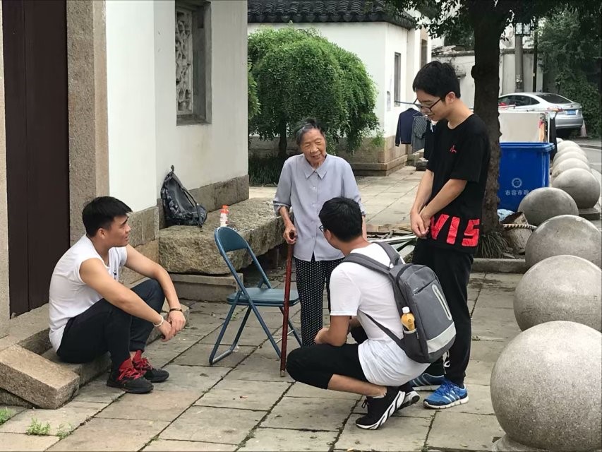 下午三点,一切准备就绪。在桃花坞社区的小巷子里,映入眼帘的是这样一番景象:穿着白背心乱窜玩耍的孩子,挂在自家屋檐下的衣服,泛着暗黄的宣传栏,座椅上说着家常的老奶奶……如此种种似乎与成员们平时的大学生活格格不入。然而从理论到实践,从衣食无忧的大学到社会的基层群众,从科技的创新到服务群众的落实,这才是团队成员这次义修活动想要突破的关键点。太阳大了就撑伞,没人来就去宣传,听不懂苏州话就请“翻译”。越来越多的社区居民前来询问,每一次,团队成员都会耐心地解释活动的内容,甚至还有热心的居民加入了义修的团队,为活动的顺利进行助力。最后成员们拉起了横幅拍下了一张溢满笑容的合照,凯旋。
