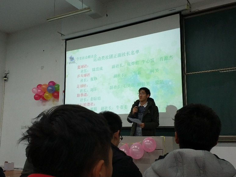 2017年11月25日晚18:00,机电工程学院学生社团联合会换届大会于苏州大学阳澄湖校区教学楼1A114顺利召开。院新媒体中心主任刘洋、新任社联主席张猛、副主席乜广齐、付双成、四大常规部门部长、九大社团社长以及全体社联、社团成员参与此次换届大会。
