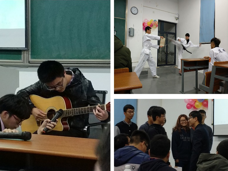 接下来的活动内容是由各个部门及社团的成员为大家带来的精彩表演,包括吉他弹唱、小品、相声以及跆拳道表演等。期间还穿插了趣味横生的游戏以及抽奖环节,大大提高了大家的积极性和参与度。