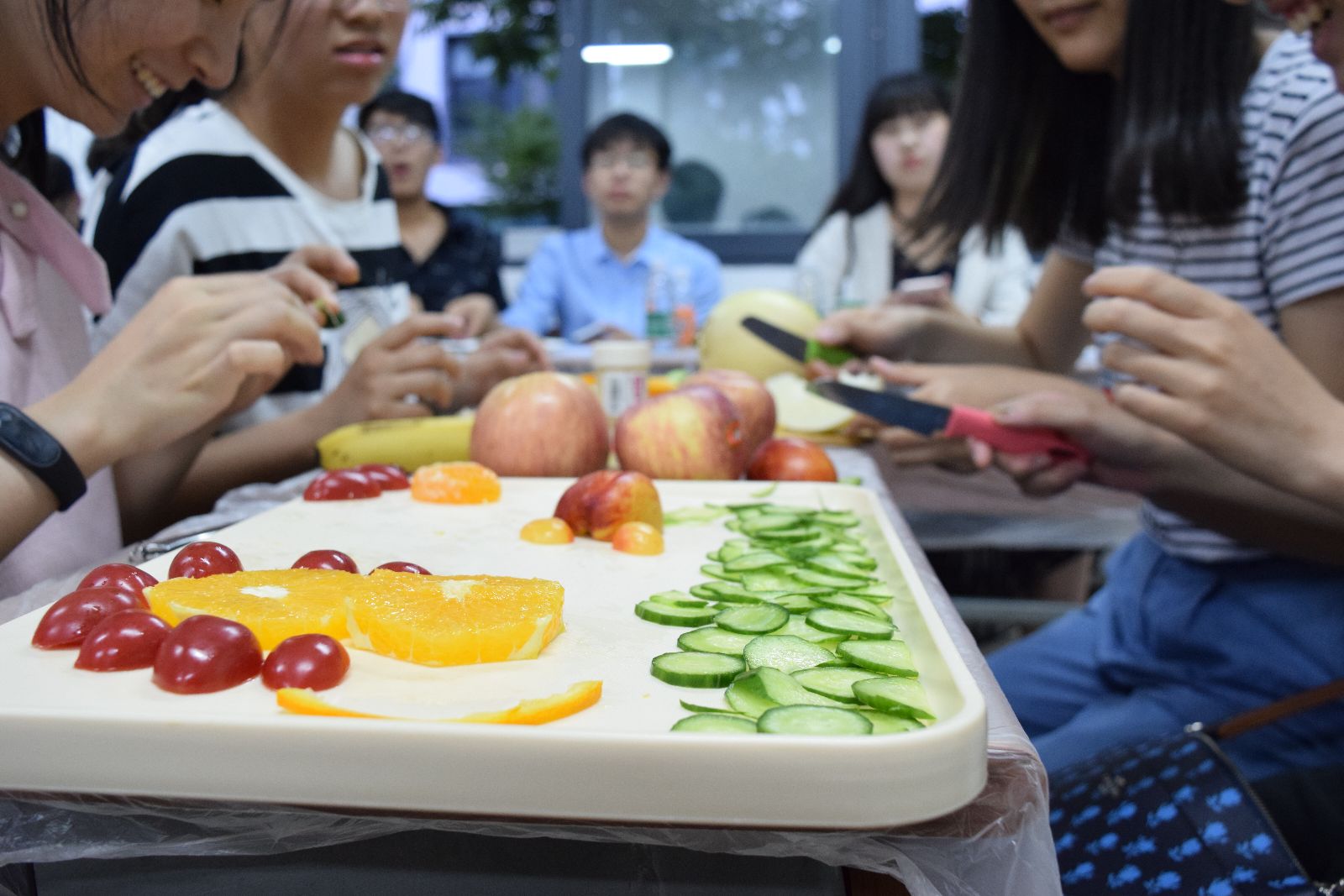 活动开始前, 各个桌子上就已经摆好了由学生会准备的丰盛的水果。活动开始,由主持人王约翰和纪仕雪介绍活动流程与比赛规则。随后同学们便以组为单位开始了自己的创作过程,大家都热情四溢,在有限的水果和空间的限制下,充分发挥各自独特的想象力和团体合作能力,将水果以各种方式拼接在一起,组成一盘盘或有趣或精美的拼盘。最后经过了评委的打分,爱吃西瓜队获得了第一名。