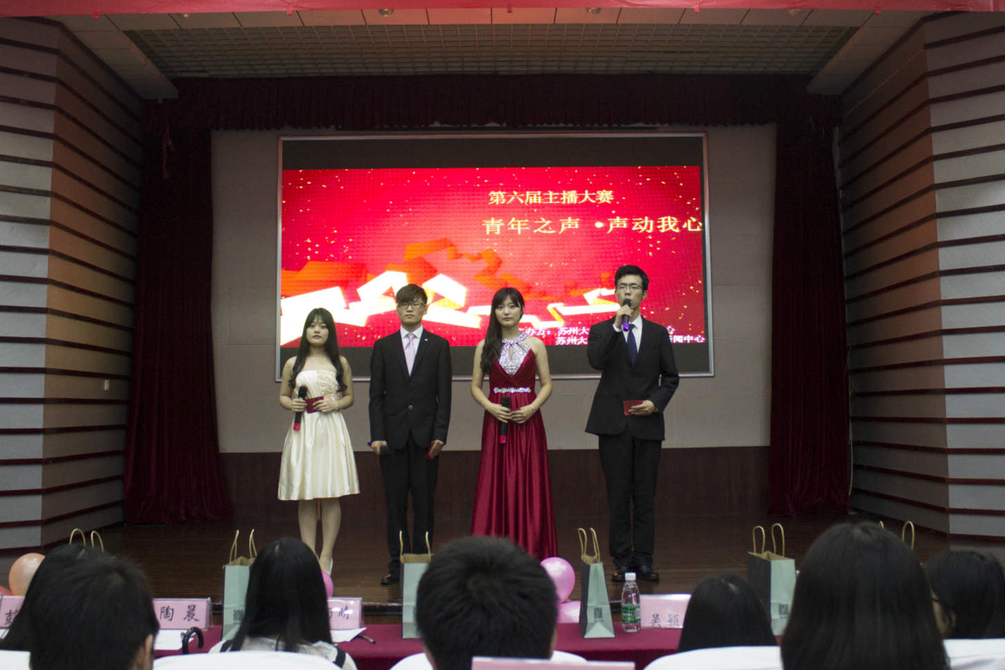 为进一步丰富校园文化生活,提高学生的艺术素养,苏州大学东吴商学院新闻中心和机电工程学院新闻中心联合举办了第六届“青年之声,声动我心”主播大赛。本次大赛决赛于6月1日晚在本部红楼学术报告厅成功举行。出席嘉宾有苏州大学商学院团委黄河老师以及各学生组织代表。担任此次决赛评委的有东区广播台台长彭逍和上届主播大赛冠军陶晨同学。