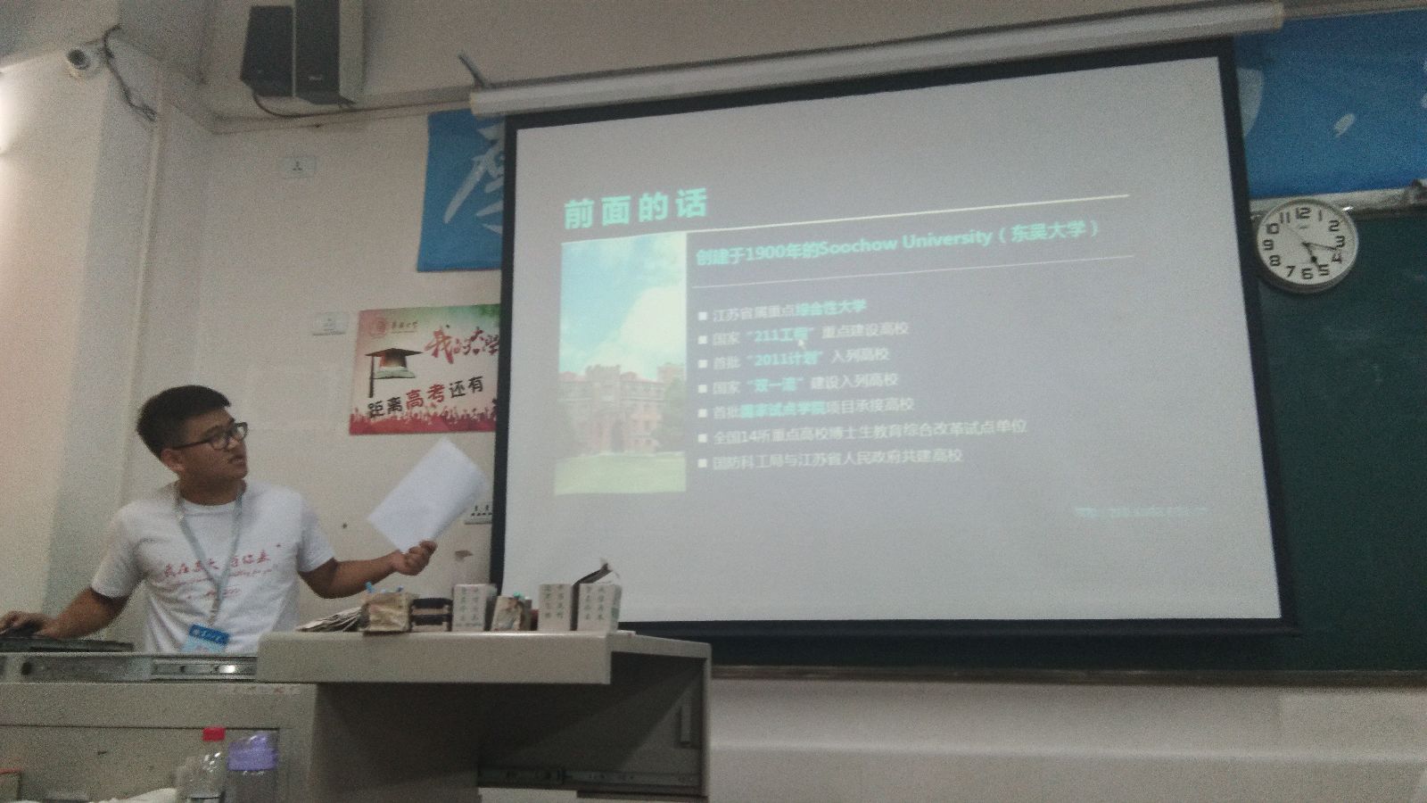 首先,成员向同学们做了简短的自我介绍并表明来意,同学们很热情,并且十分期待。然后就学校提供的宣传ppt,成员们从各个维度对苏大做了介绍,让同学们对苏州大学有个初步了解。其次,给同学们播放了宣传视频,在播放视频的同时就视频内容介绍了苏大的一些细节和周边情况、和同学们分享自己的大学生活体验。最后是提问和交流环节,同学们积极提问,关于苏州大学、大学生活以及高中学习等各个方面,同学们都提出了自己的疑问,团队成员从自己认知的角度一一给出了解答。时间过的飞快,下课声响起,宣讲会也告一段落。