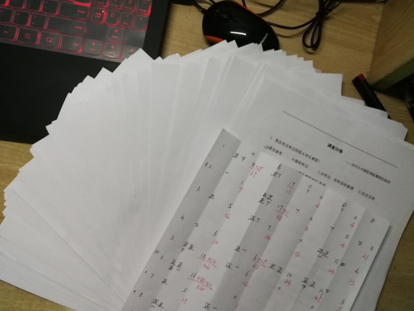 纸质问卷由于数量较多,题目较多且选项大多为多选,所以成为了数据统计阶段的一个硬骨头。队员们脚踏实地,分工明确,一丝不苟的对所有的调查问卷逐一统计,并且进行了基本的验证,获得了准确全面的数据。对于网络问卷,队员们通过计算机也获得了精确的结果。
