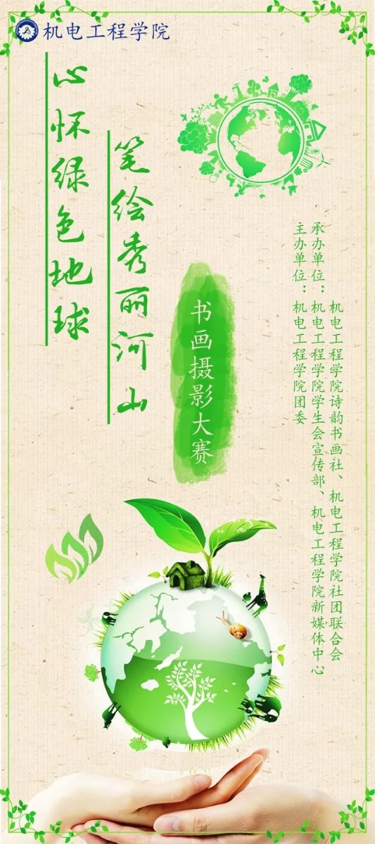 为迎接第49个地球日的到来,由机电工程学院团委主办,机电工程学院诗韵书画社、学生会宣传部、学生社团联合会、新媒体中心承办的名为“心怀绿色地球,笔绘秀丽河山”的书画摄影大赛,在全校学生当中征集、评选并展示以“保护环境,节约资源”为主题的创意作品,通过书法、绘画、摄影等多种形式,展现绿色地球的生态之美。旨在唤醒广大学子节约资源、保护环境的意识,倡导新时代节能减排,绿色生态的发展方式。