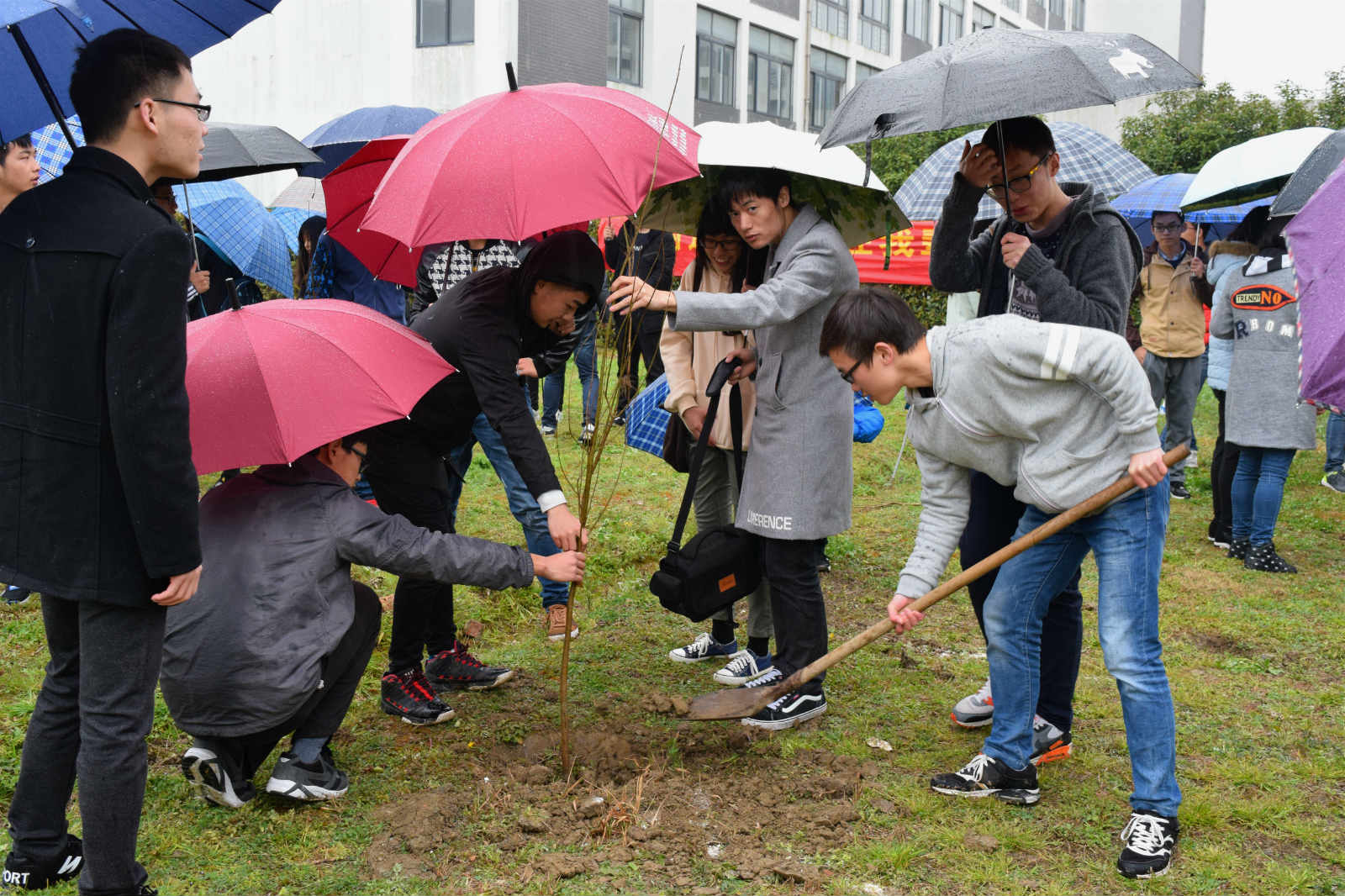 活动开始之初,空中还下着细雨,承办方青协将早已备好的爱心雨伞发放给每个人。在青协成员的带领下,全体人员热火朝天的投入到植树中。虽然天公不作美,但同学们仍表现出极大的热情,满怀着对绿色生命的渴盼与尊重,挖坑、扶苗、填土,所有的步骤有条不紊地进行着。每棵树都挂上了红色的标签,写上各个单位的名称,表达了大家对小树苗能够茂盛生长的期盼。活动结束后,新闻中心给同学们拍照留念。