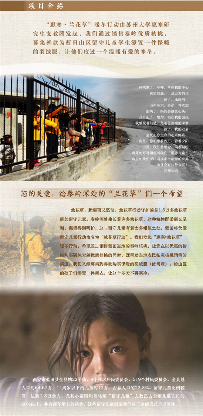 活动介绍:通过销售蓝田当地优质核桃,帮助当地农民拓宽核桃销售渠道、缓解核桃销售压力,募集善款给山里的留守儿童们添置一件保暖的羽绒服,让他们过一个温暖有爱的寒冬。