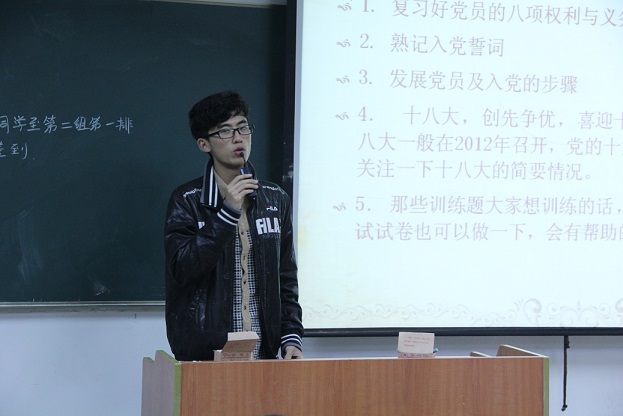 首先,刘泽同学向各位入党积极分子介绍了本次培训的主要内容与流程,强调了本周三党校结业考试的注意事项。随后,由去年参加党校考试并取得优异成绩的2014级机械类张伟同学向各位入党积极分子分享考试经验。张伟同学精心归纳准备了易考知识点及复习纲要,用幻灯片形式向大家展示,并加以耐心的讲解与分析。现场同学聚精会神地听着,并不时记录要点,大家在本次培训中受益匪浅。