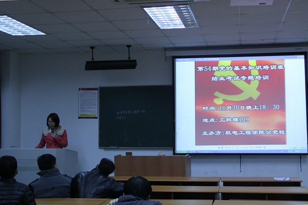 11月30日晚6:30,由机电工程学院分党校主办的第54期党的基本知识培训班结业考试专题培训在工科楼109教室召开。培训由机电工程学院分党校负责人刘泽同学主持,第54期全体入党积极分子参加了本次培训。