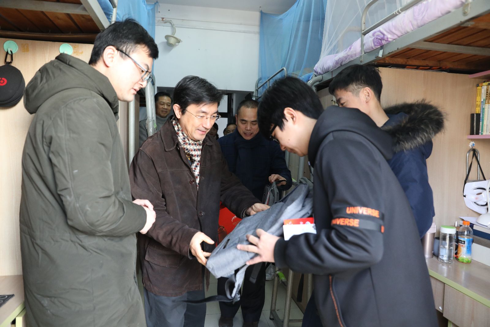 校领导一行来到阳澄湖校区8号宿舍楼慰问我院留校学生。在8B-304宿舍,宿舍里的同学已经早早的起来学习,见到了校长十分惊喜。熊思东校长亲切得询问了他们的学习情况、饮食住宿和安全等问题,叮嘱留校学生在校期间要注意安全,保重身体,要和家长、老师保持联系,并且嘱咐留校学生春节尽量回家和家人一起过,要同时顾全学习和亲情,并提前预祝同学们节日快乐。最后,熊思东校长还为留校学生送上提前精心准备的礼物,祝愿大家身体健康,学业有成。在聆听了熊校长的祝福后,我院彭浩等留校同学对学校的关怀表示感谢,并祝愿学校事业蒸蒸日上。