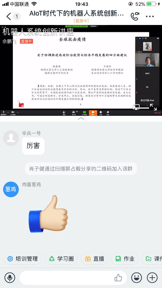 北京邮电大学叶培大创新创业学院王程森同学表示:借空中课堂,享知识盛宴,牵网线相连,听大师论道。这次《AIoT时代下的机器人系统创新》线上讲座成功的举办,不仅丰富了疫情期间学生的学习生活,还帮助大家了解了机器人的前沿科技与发展瓶颈,明确自己的发展方向,形象而又生动的贯彻落实了教育部“停课不停学、停课不停教”的方针。