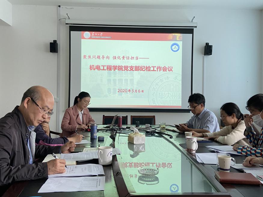 为提升支部纪检委员履职尽责意识,推动全面从严治党向学院基层延伸,2020年5月6日,机电工程学院党支部纪检工作会议在阳澄湖校区行政楼218会议室召开,学院党委书记刘鲁庆、专职纪检委员袁洁、党风联络员沈爱军以及全体支部纪检委员参加会议,会议由袁洁专员主持。