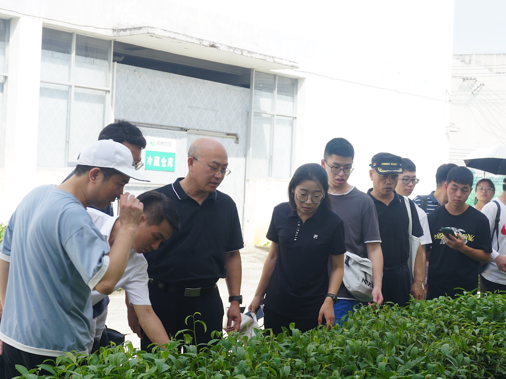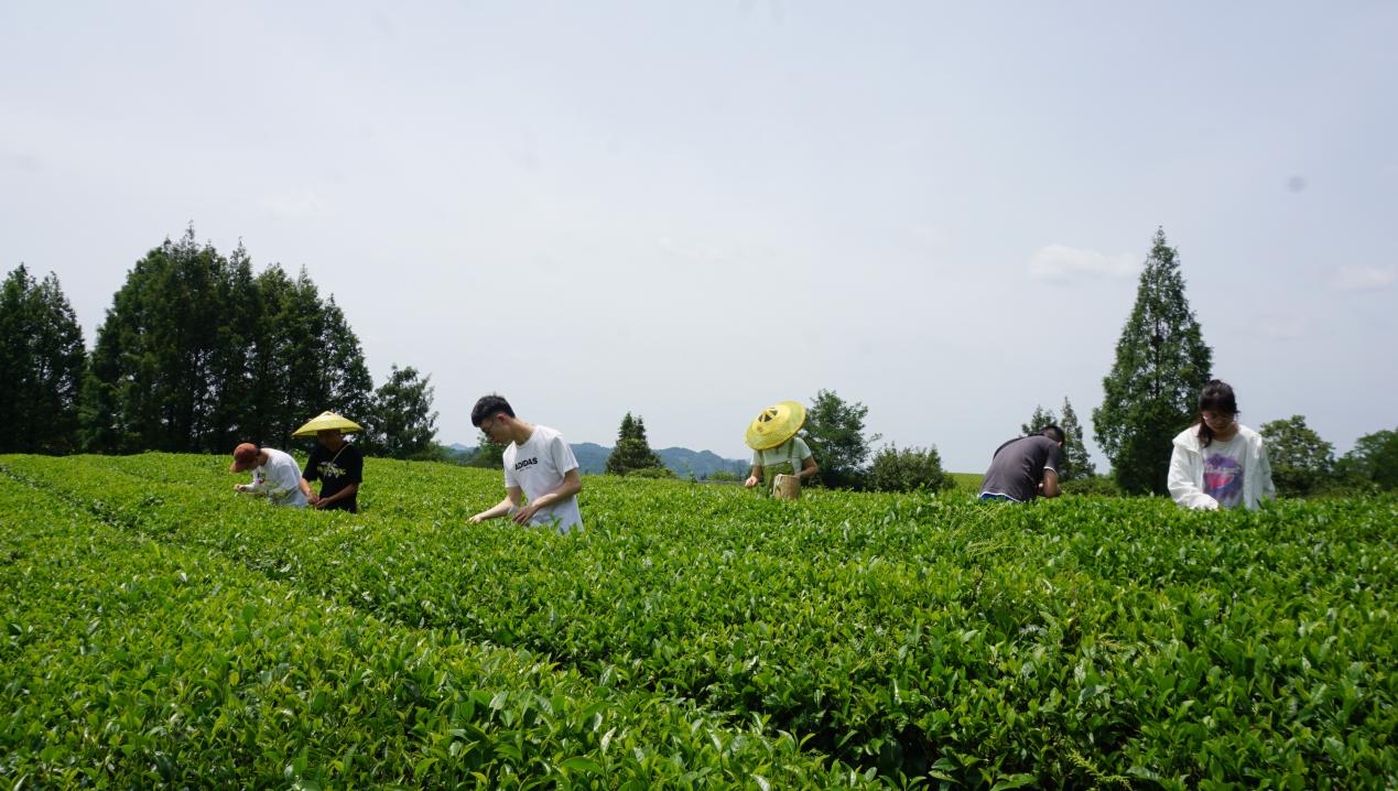 下午,实践团队来到湄潭县茶海景区对茶叶种植、采摘等生产方面问题进行调研,实践团队师生进入茶园采摘茶叶,结合专业知识为茶叶采摘提出机械化改良方法。
