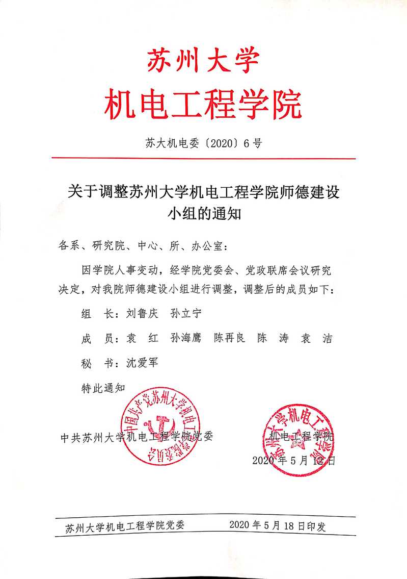 关于调整苏州大学机电工程学院师德建设小组的通知