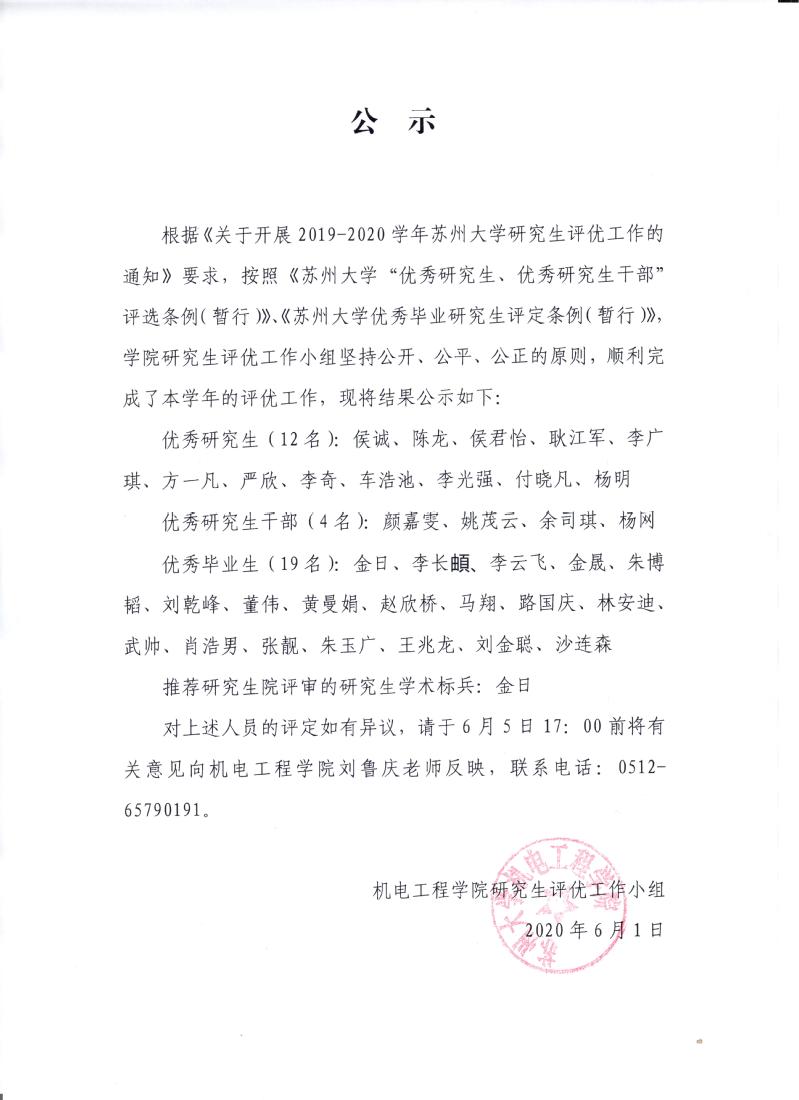 19-20学年苏州大学机电工程学院研究生评优结果公示