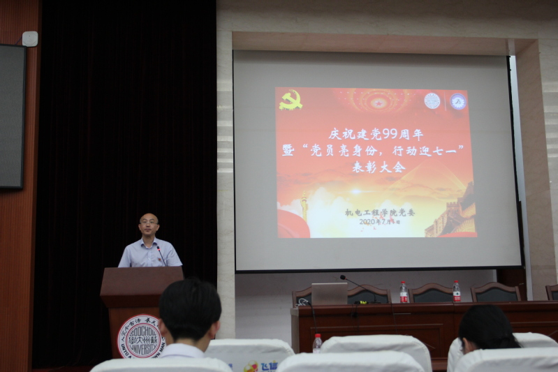7月1日,机电工程学院党委在阳澄湖校区大报告厅举行庆祝建党99周年暨“党员亮身份,行动迎七一”表彰大会,回顾建党99年来的光辉历程,举行新进校青年教师的党员导师聘任,表彰学院2019年优秀共产党员和先进集体,激励全院党员对标争先,立足本职,以实际行动为加快学校“双一流”建设、推进学院高质量发展做出新贡献。学院在苏党员师生参加了会议,会议由学院党委副书记袁红主持。