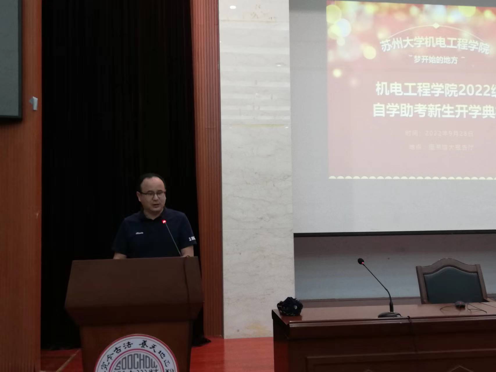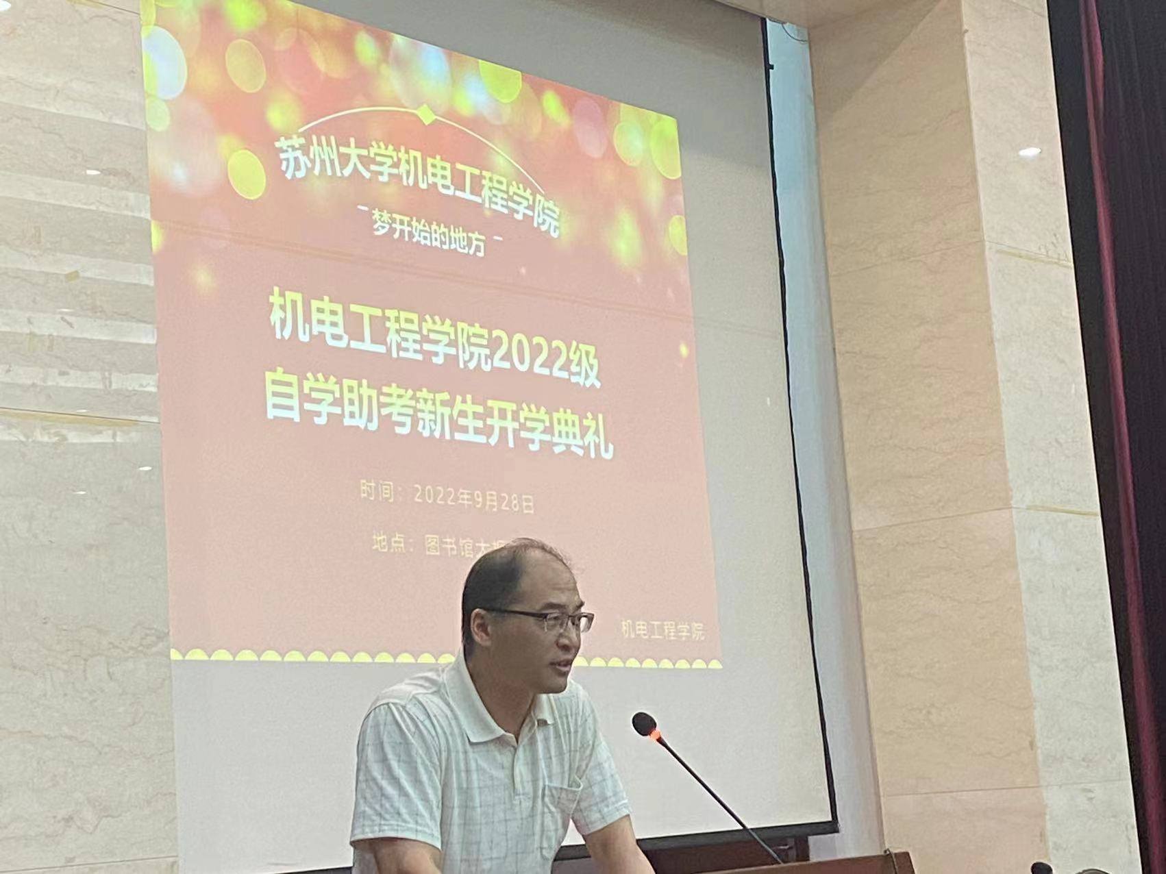 9月28日下午,我院2022级自考助学新生开学典礼在苏州大学阳澄湖校区图书馆大报告厅顺利举行,副院长孙海鹰、自学考试办公室王平老师、各班班主任王建胜、丁效平、华梁老师,133名新生参加了开学典礼。本次典礼由自考秘书王平老师主持。