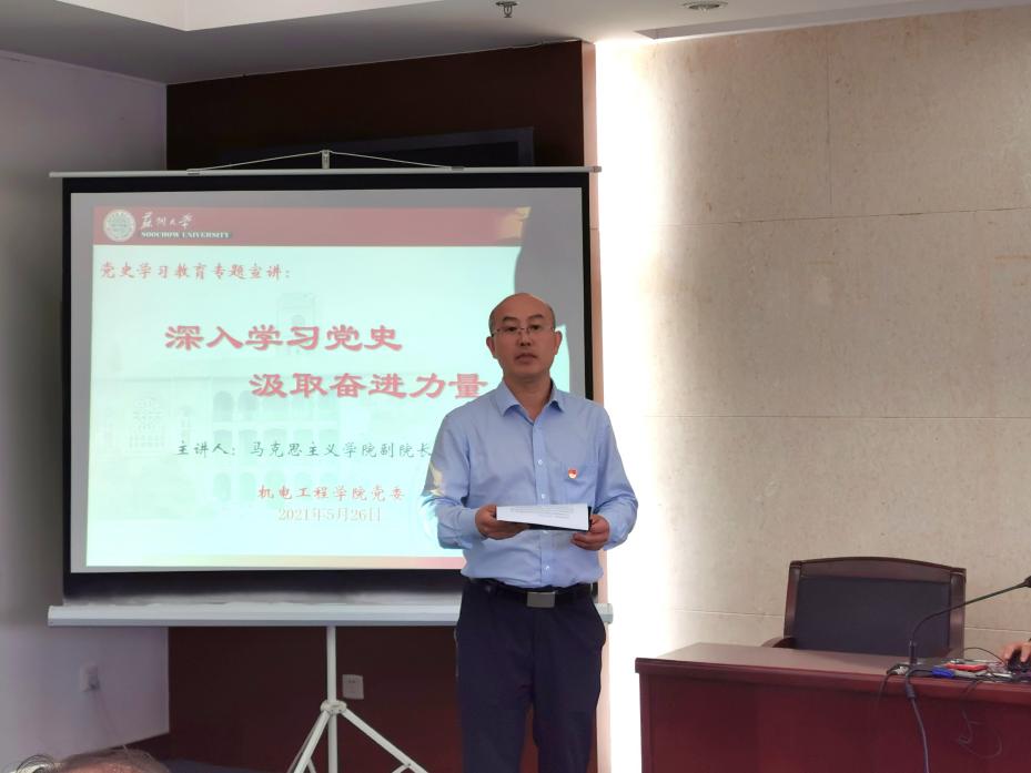 5月26日下午,苏州大学机电工程学院党委在阳澄湖校区行政楼300室组织开展党史学习教育专题宣讲,邀请苏州大学党史学习教育宣讲团成员、苏州大学马克思主义学院副院长朱蓉蓉教授以“深入学习党史 汲取奋进力量”为题作专题报告。我院党员师生代表参加宣讲会。会议由院党委书记刘鲁庆主持。