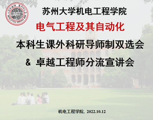 为全面推进苏州大学“铸魂逐梦”育人工程,深化“三全育人”综合改革方案,2022年10月12日下午,机电工程学院2021级电气工程及其自动化专业本科生课外科研导师双选会顺利召开,本次活动为本科生提供个性化的课外学习指导,引导青年学子积极参与课外科研项目和学科竞赛。会议由自动化工程系主任余雷主讲,2021级电气专业班主任林健荣、章月圆和全体2021级电气专业学生参加。