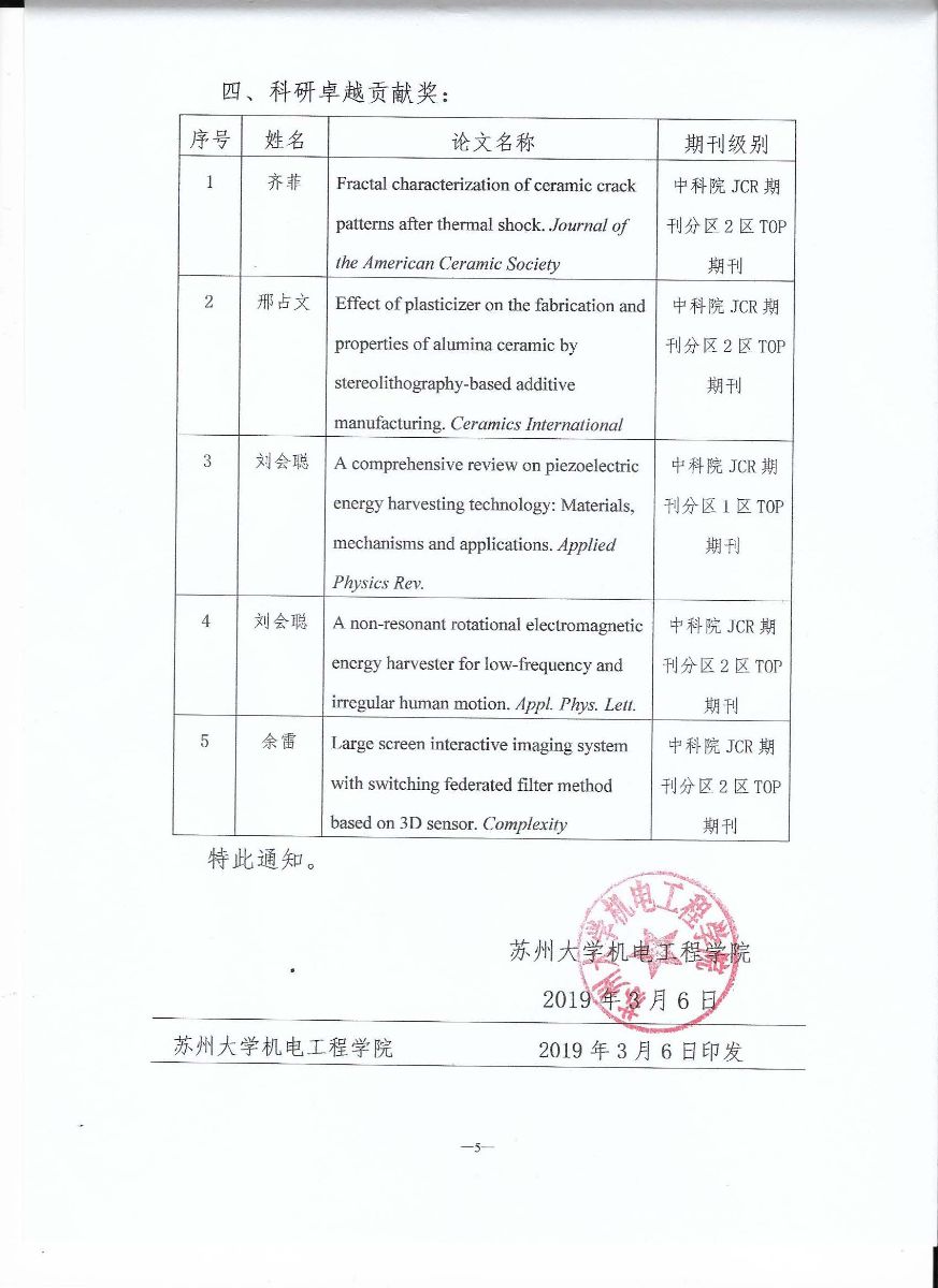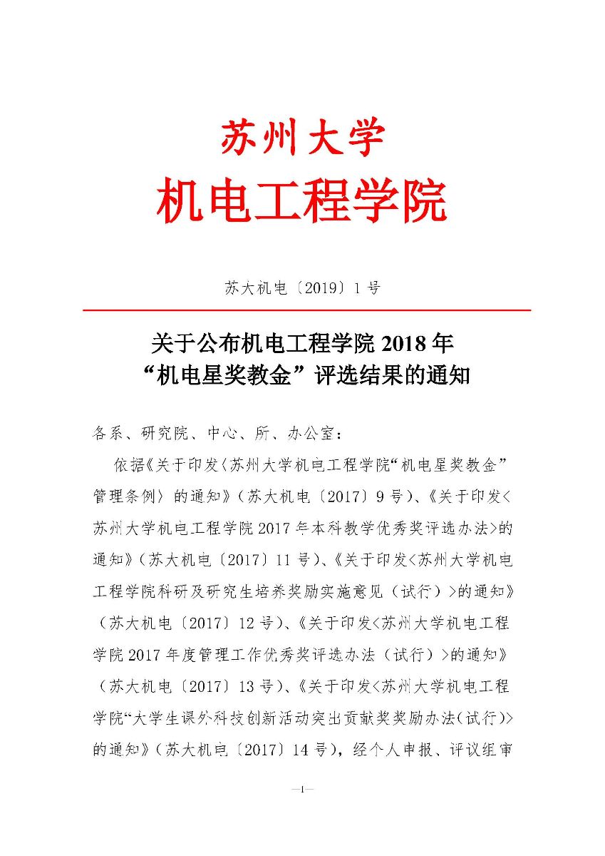 关于公布机电工程学院2018年“机电星”奖教金评选结果的通知