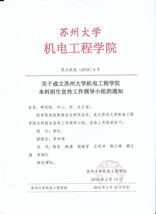 关于成立苏州大学机电工程学院本科招生宣传工作领导小组的通知