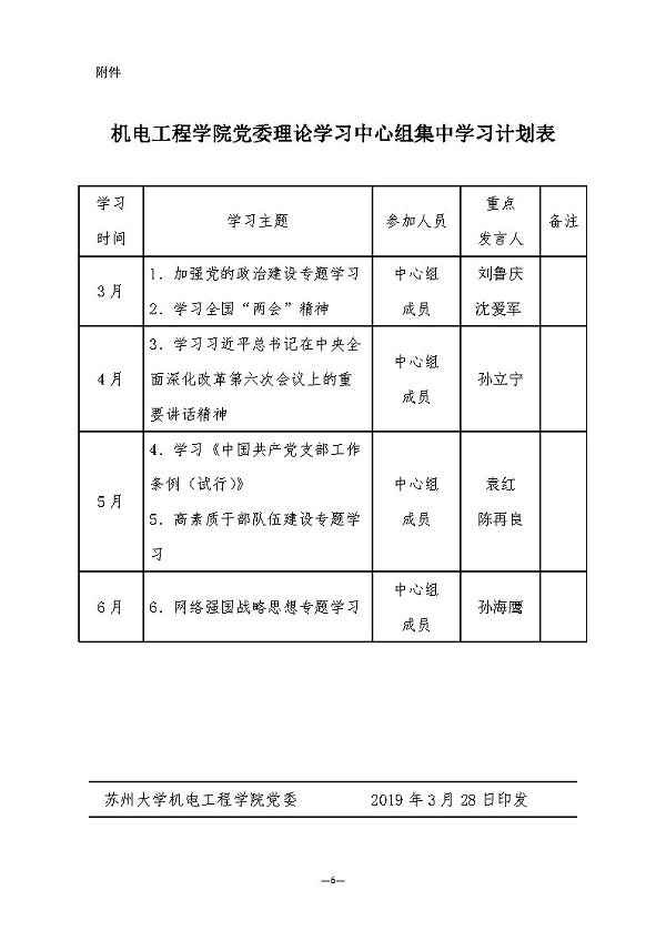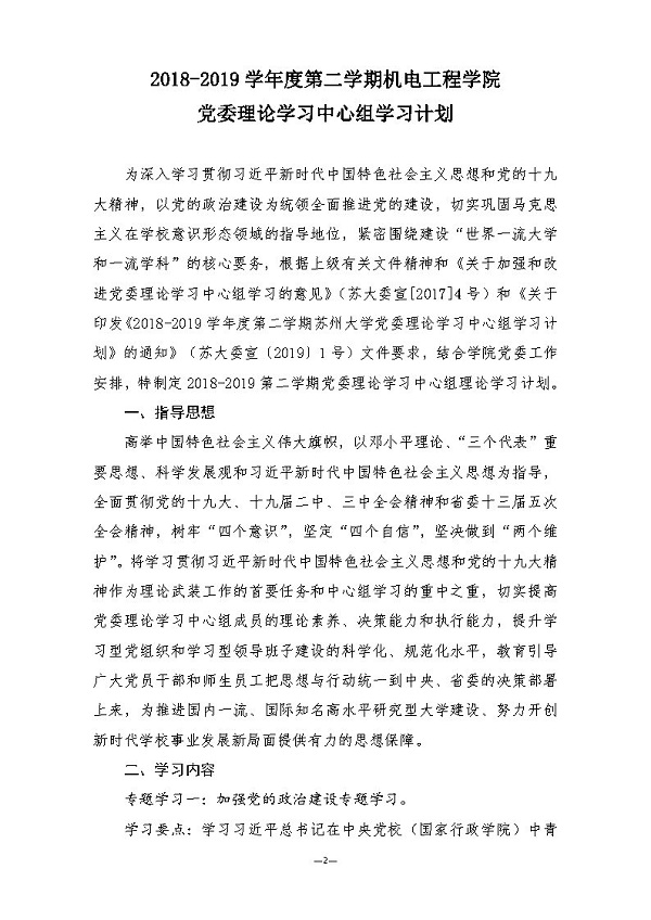 关于印发《2018-2019学年度第二学期苏州大学机电工程学院党委理论学习中心组学习计划》的通知