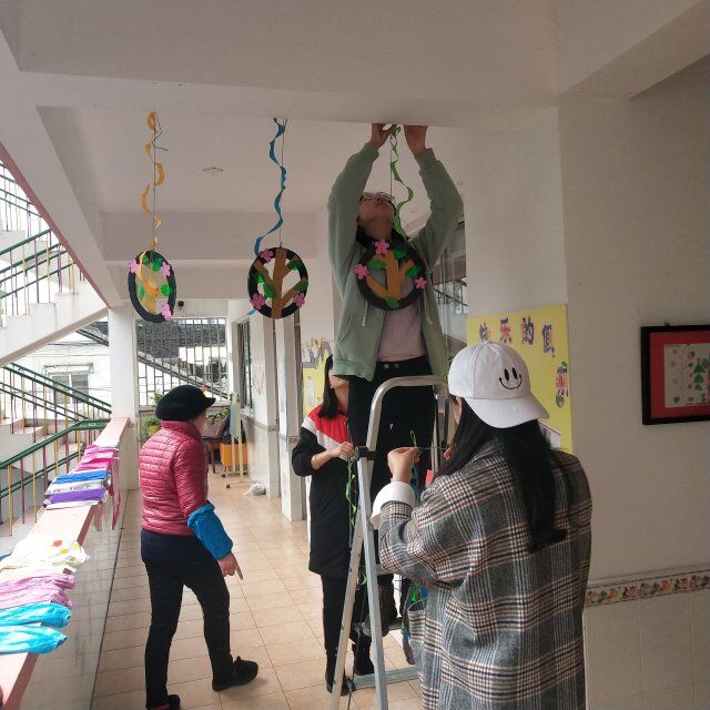 班级里的老师给志愿者们分配了任务,个子高的男同学帮老师们挂起了风铃;细心手巧的同学们拿起了手工剪刀帮老师们做起了剪纸;有的志愿者帮老师画起了小云朵;有的志愿者帮老师们将小朋友的照片贴在展示墙上;有的志愿者还帮午睡的小朋友整理起了衣服。大家各有各的任务,都认真地动起手来。