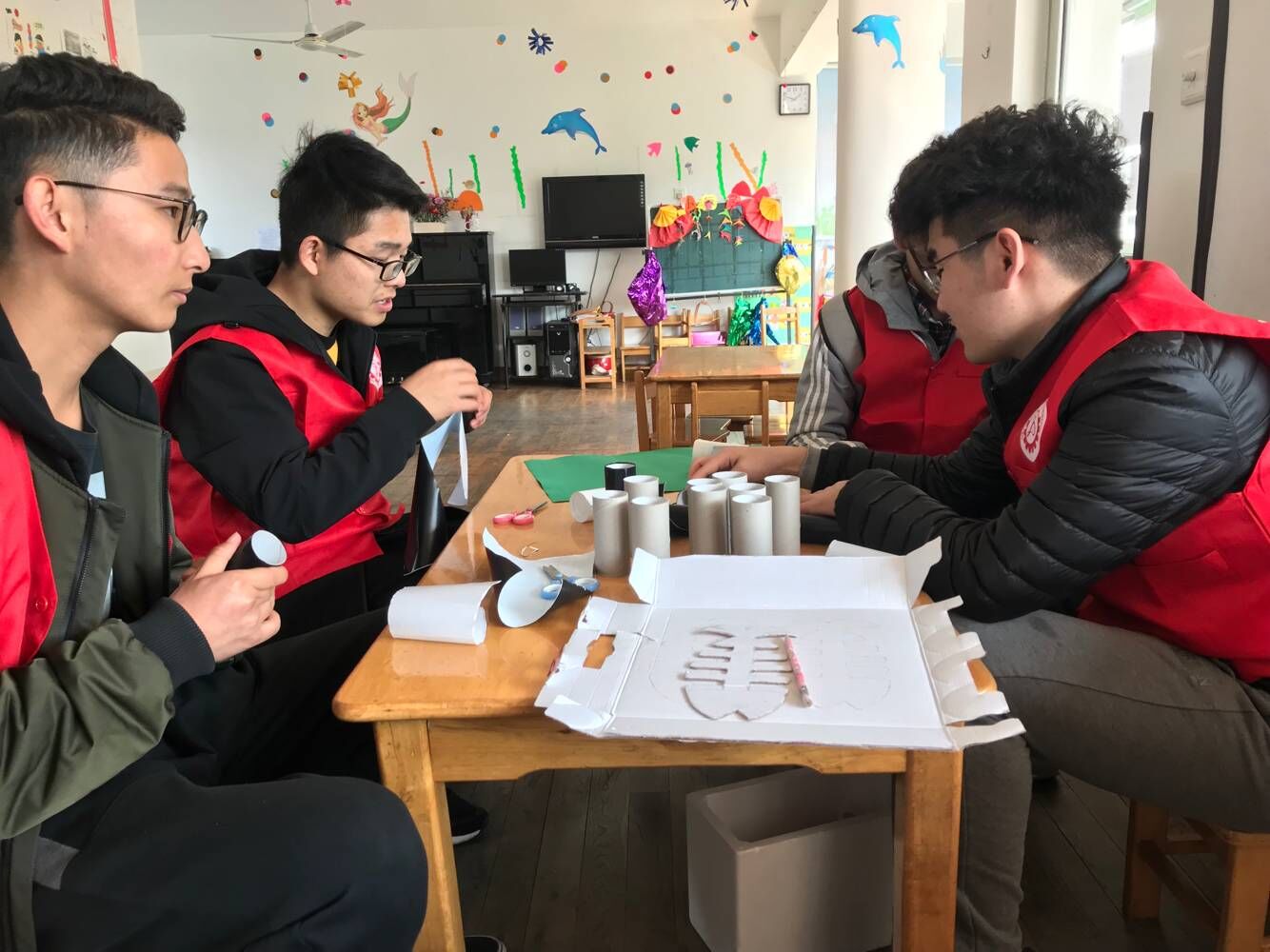 我们四人在三楼制作手工,这次的手工任务是用纸筒做成树木。我们一开始还无从下手,但是经过老师的讲解之后大家都领会到了方法,认认真真的开始制作。