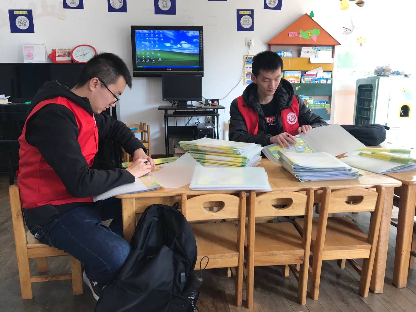 另外两位同学一开始则是在帮小朋友们的书本写名字,所以没有耽误很长时间。