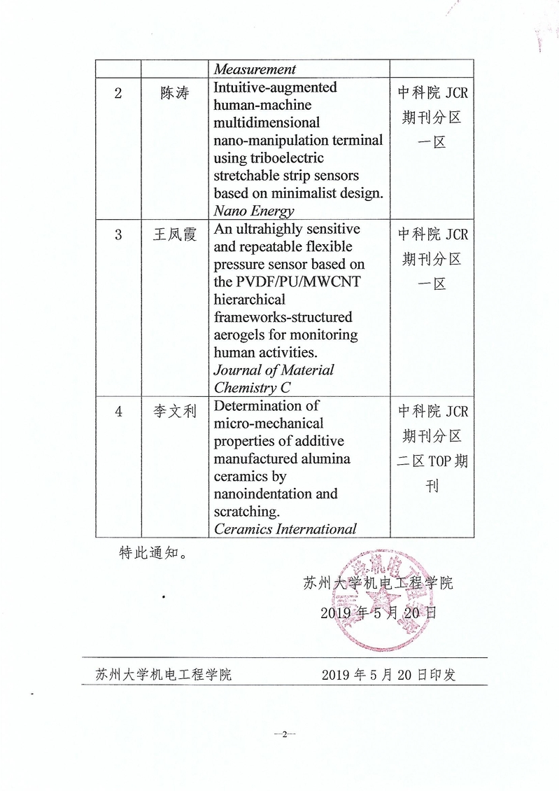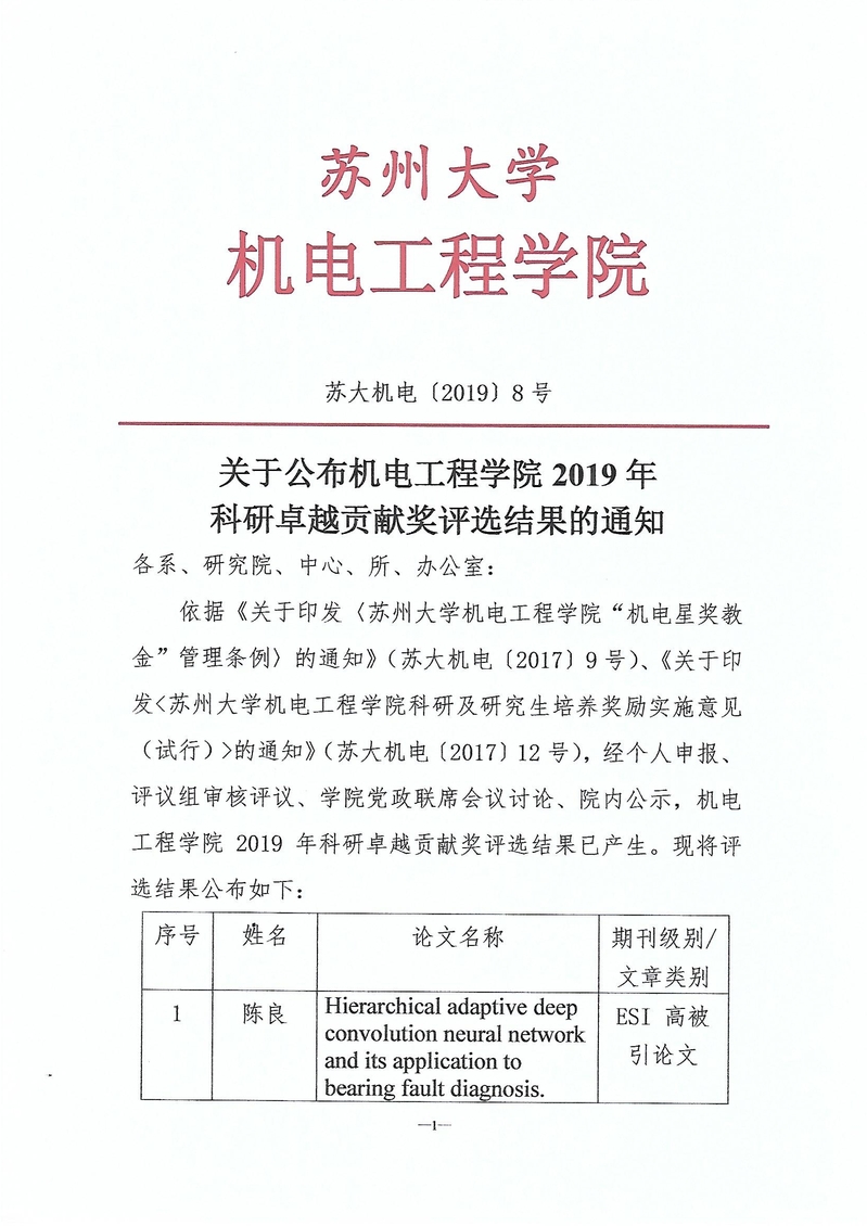 关于公布机电工程学院2019年科研卓越贡献奖评选结果的通知