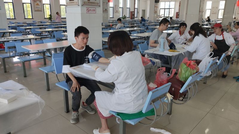 献血活动当天天气晴好,微风拂过每个前来献血志愿者微笑的脸庞,因为他们深知,不久的将来,这些血液将会用来挽救他人的生命。鉴于前几学期献血拥挤的问题,本次献血活动采取了分流的措施,我们让下午有课的同学中午吃完饭来到食堂二楼进行献血,下午没课的同学在1:30之后来献血处献血,以保障每一位想要献血的同学可以献血成功。