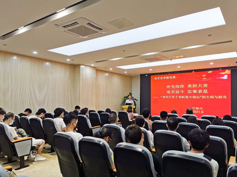 随后,刘鲁庆书记为现场师生上了一堂别开生面的党史故事微党课,生动讲述刘邓大军千里跃进大别山的革命故事,传递英雄先辈勇担革命使命的大局与担当,让现场师生从鲜活的党史故事中深刻领会刘邓大军千里跃进大别山的精神内涵——听党指挥、勇担大责、艰苦奋斗、实事求是,要求党员师生增强“四个意识”、坚定“四个自信”、做到“两个维护”,严守政治纪律和政治规矩,坚定共产主义信念,牢记全心全意为人民服务的宗旨,从实际出发,勇于探索,积极担当,努力作出经得起人民和历史检验的业绩。纪检委员姚建萍也为即将进入社会的党员学生们送上寄语,告诫同学们要时刻牢记党员初心,克服贪婪心、失衡心、从众心、侥幸心、虚荣心、对抗心,算好政治账、经济账、名誉账、幸福账、自由账、感情账、健康账,做一名有担当的共产党员。