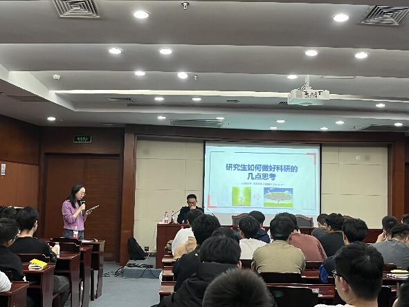 杨湛教授随后分享了他在日本名古屋大学留学的经历,介绍了日本研究生培养方式和国内的不同之处,鼓励学生们主动跟不同文化背景的同学交流,相互包容,博采众长,同时,结合自身奋斗拼搏经历,给予了同学们鼓励和指导。朱铭鲁副教授从实践经验出发,提醒同学们可以从日常生活发现idea,并详细介绍了学院的发展情况和科研实力,增进了同学们对所学专业的信心。范新建老师分享了很多科研“干货”,特别是在文献查找、数据处理、软件作图等方面的实用经验,鼓励大家要尽快发出自己的第一篇论文,强调科研成果的正反馈对研究生学习的重要作用。