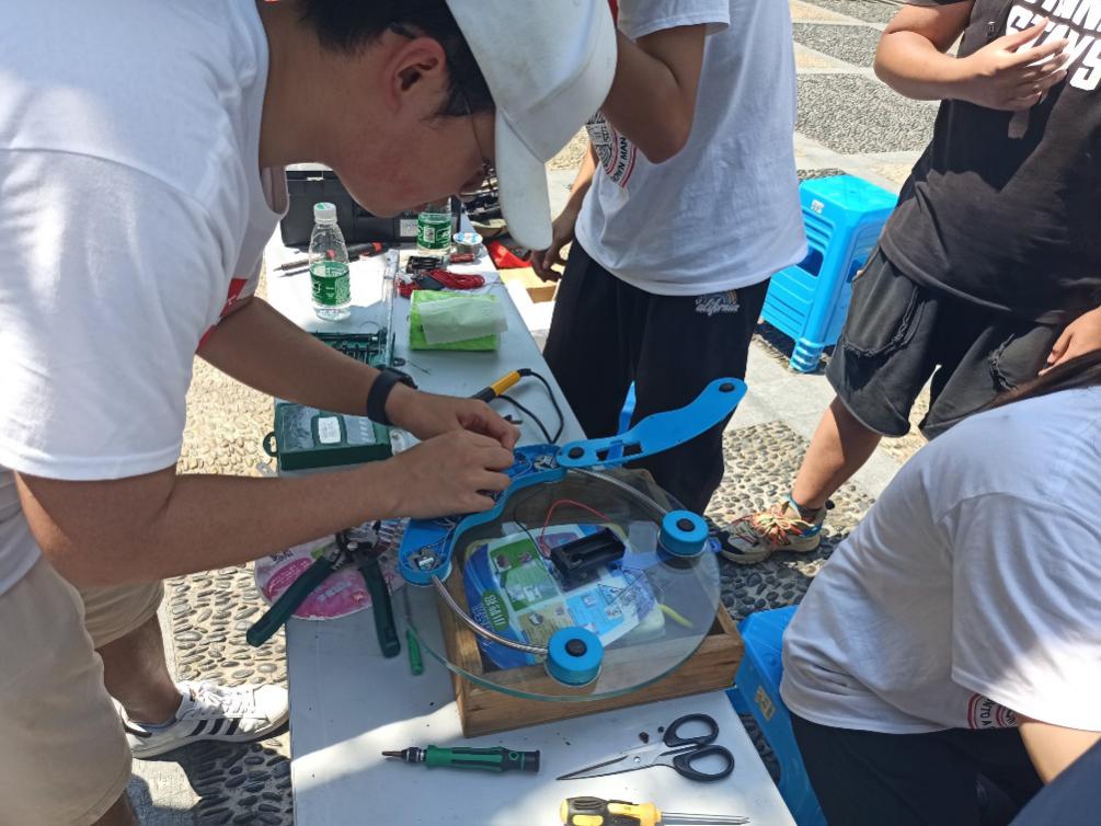 烈日炎炎,社区比较简陋,没有专门服务的平台。小组成员互相之间打遮阳伞,乘着树荫,攻克一个又一个难关。活动快要结束时,还剩几个没有修理好,虽然社区人员建议小组成员可以之后再来,但看着有些老人已经在酷暑中等待很长时间了,而且有的是大件的家电,来来回回搬运费时费力,队友们决定把所有家电修好再走,获得了社区居民和相关工作人员的一致夸赞。