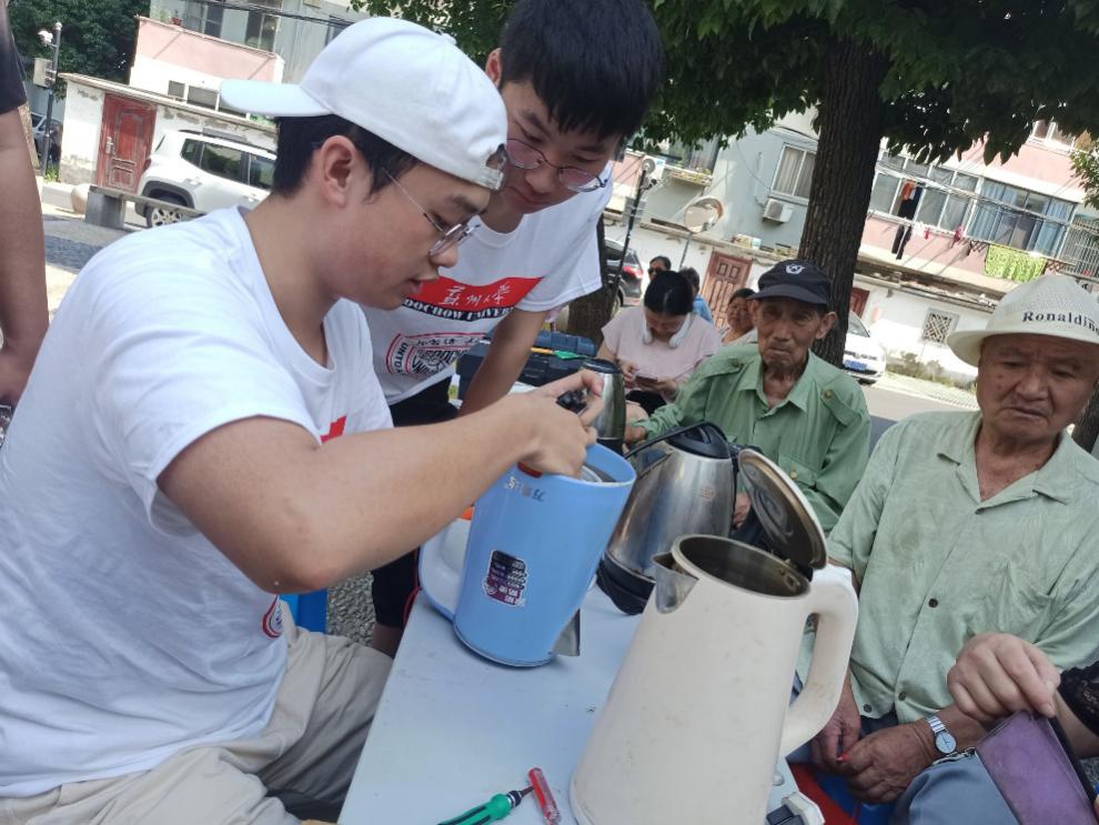 上午8点30分,义修小组便已经来到社区,似火的骄阳挡不住志愿者的满腔热情,大家分成多个小组走家串户为社区居民开展义修服务。得知义修小组在这里开展家电维修活动,小区的居民纷纷将自己家中损坏的电器拿来维修,如电风扇,电热水壶,收音机,路由器等电器设备。当被问及志愿工作累不累,需要什么帮助时,小组成员李华(化名)停下手中的活摇了摇头笑着说:“通过自己所学到的技能帮助居民做一些力所能及的事情,心里其实挺高兴的。”旁边的同学用手指着旁边等待修理的家电,“他们(社区居民)拿过来的都是一些比较简单的家电,而且我们一天能修十多个差不多,有时候会遇到新的问题,不过只要原理掌握好,万变不离其宗。”说完,他一边把风扇螺丝上好,插上插座,拧开了刚刚修好的电风扇,气流呼啸而出,他擦了擦额头上的汗水,脸上洋溢着慢慢的成就感。“他们对我们要求不高,如果实在是修不好或者修坏掉了,他们也不会为难我们。”另一位同学又补充道。